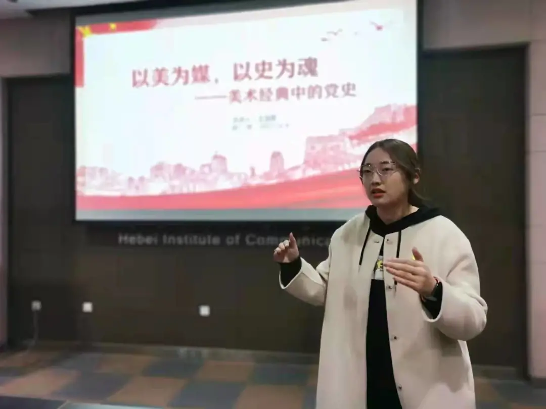 一是党员讲。主讲团队为党支部中的师生党员,在学期初做好授课教案、课件和授课计划,在备课过程中,提升党史理论知识素养。从中国共产党成立以来各个历史时期,特别是党的十八大以来的美术作品中,遴选出100件最具代表性的美术经典作品,生动再现中国共产党100年来波澜壮阔的光辉历程。