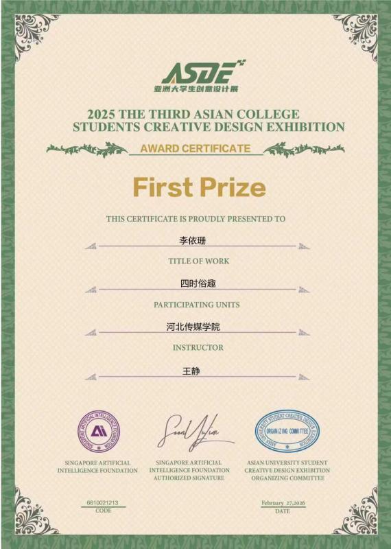 我校始终坚持以赛促教、以赛促学的人才培养理念,积极搭建实践育人平台,鼓励学生参与高水平学科竞赛,不断强化创新思维与实践能力培养。此次获奖是我校视觉传达设计专业教学成果的又一次集中体现,学校将继续深化实践教学与创新能力培养,持续推动专业建设与人才培养质量再上新台阶。