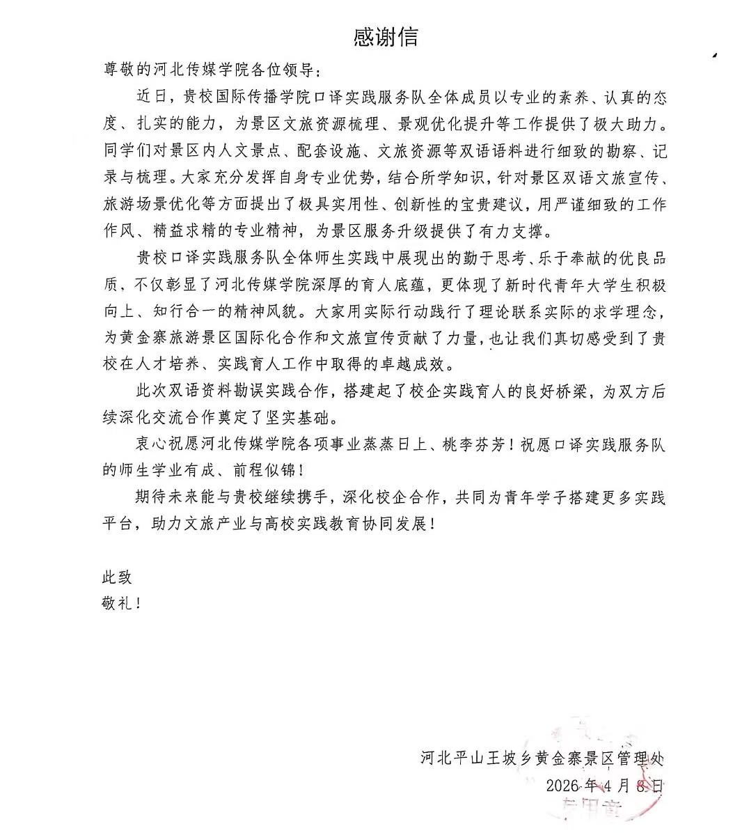 近日,我校国际传播学院英语专业口译实践服务队,圆满完成河北平山黄金寨景区双语导览册勘误工作,凭借扎实的专业能力与严谨的工作作风,获得景区赞誉。